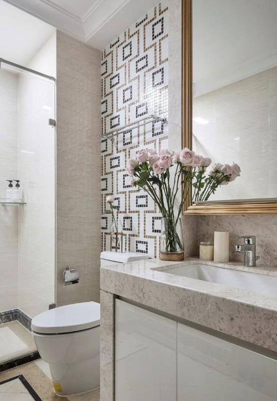卫生间的设计,很简单。干湿区分离,大理石的洗漱台、加上铜色边框镜子、马赛克的背景墙,整体氛围比较舒适。