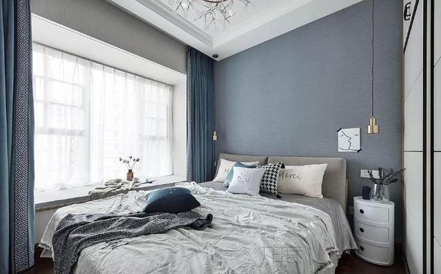 卧室内,一整面墙宽度的大飘窗,带来满屋的阳光,整个房间通透明亮。床头边是孔灯,放在床头边,光线不会直接照射到眼睛。衣柜做了推拉门,更节省空间。并安装阻尼器使密封性比较好。
