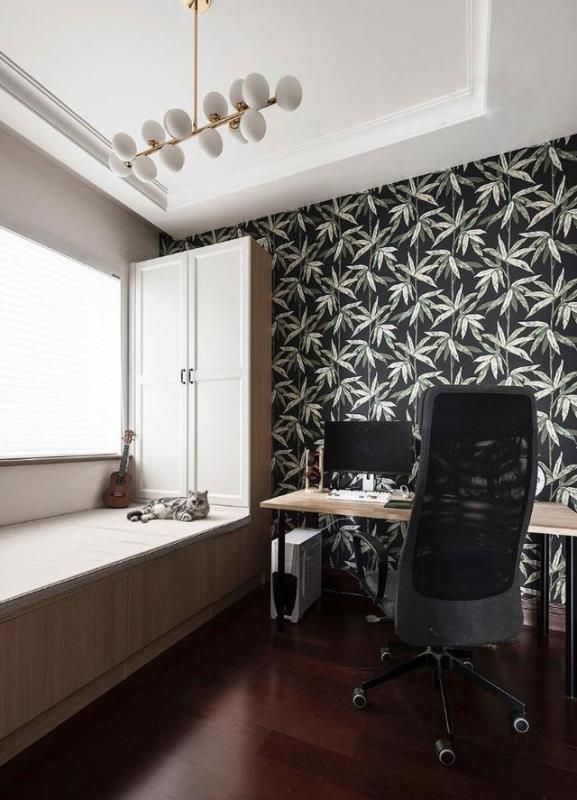 书房使用的是百叶窗帘,保持足够照明且使光线柔和不刺眼。书桌后的绿植系壁纸,是专门为房主打造的。工作疲惫时可以看看绿色放松双眼,旁边的榻榻米休息与收纳的功能兼具。