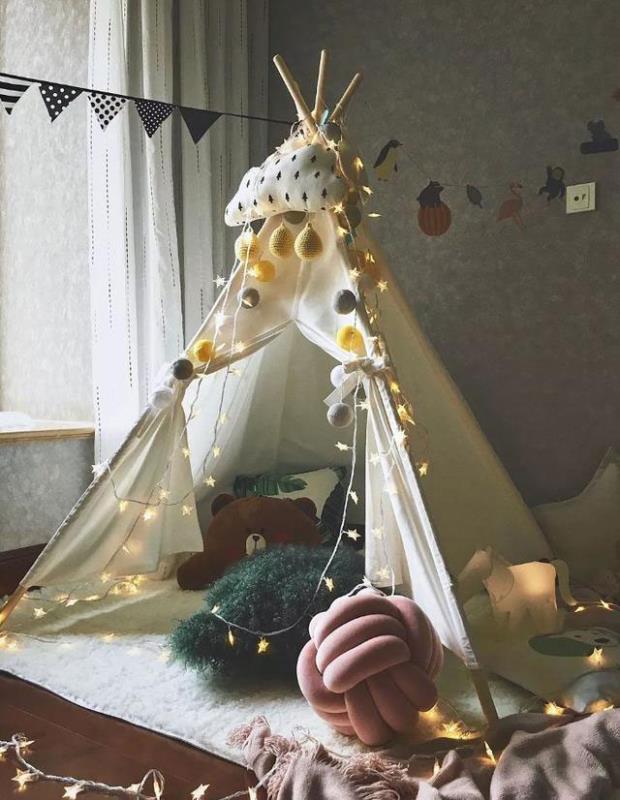 儿童房暂时空置,所以就根据房主的爱好,设计了满满少女心的小角落,一个手工搭建的小小帐篷,配上彩灯与毛绒玩具,感觉少女心十足!