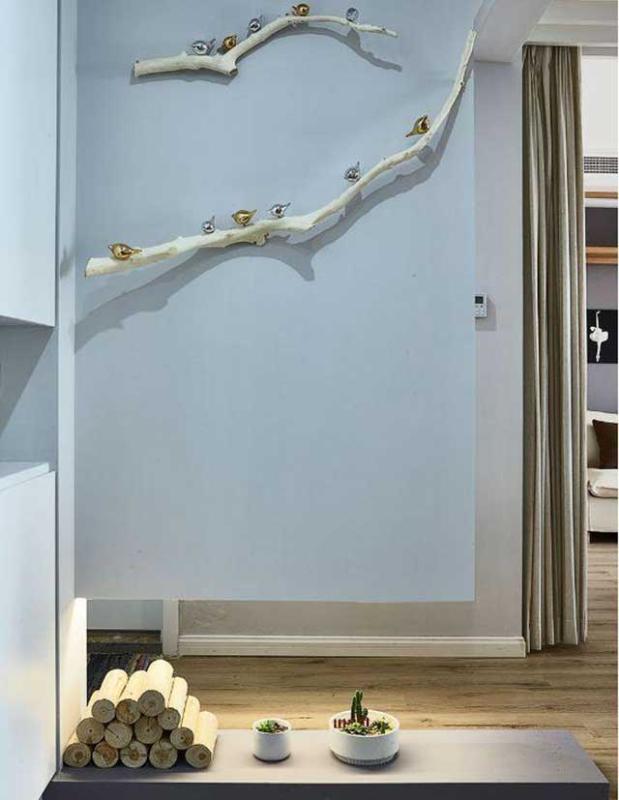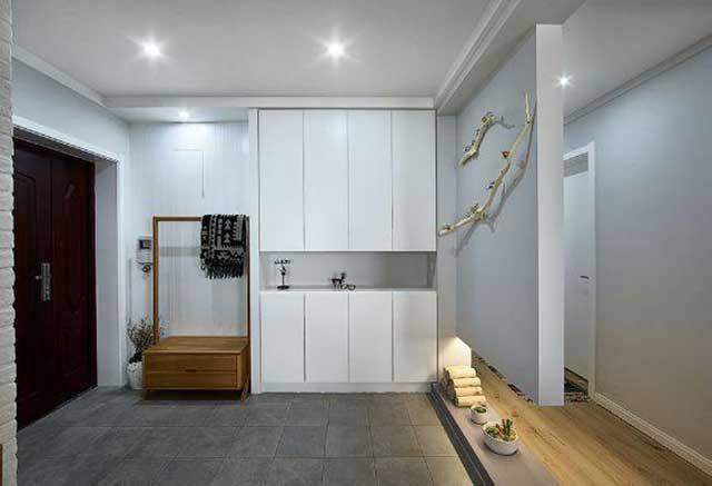 进门处用地砖,设计师考虑到下雨天的时候,进门容易踩湿地板而且容易脏,而瓷砖便于打理。还可以从视觉上区分了玄关的空间。木质衣架,配上边上的定制玄关柜,特别的简单大气实用。