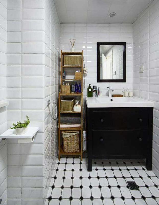 整屋全贴着白色的小瓷砖,在光线的照射下卫生间显得特别的宽敞亮堂。搭配深色系的卫浴柜十分的大气,边上角落空位也不能放过,放置一置物架,满足了收纳和摆放。