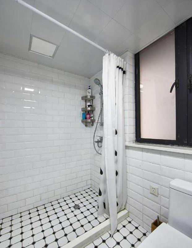这边是干净利落的窗帘式的淋浴间了,墙角还贴心的设计置物架摆放沐浴露之类的洗漱用品。