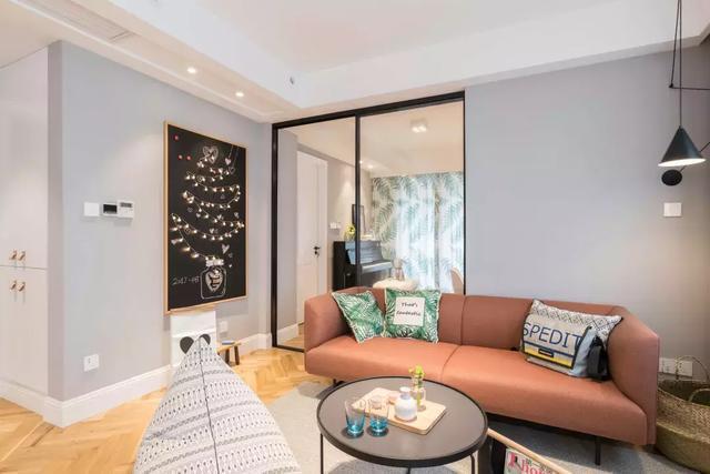 客厅和餐厅是开放式的,大大增加了空间感以及视觉感。砖红色的拼接沙发,配上几个个性的小抱枕,舒服温馨。米白色的地毯,在视觉上把餐厅和客厅隔开,一个黑色几何小茶几放在上面,简单唯美。