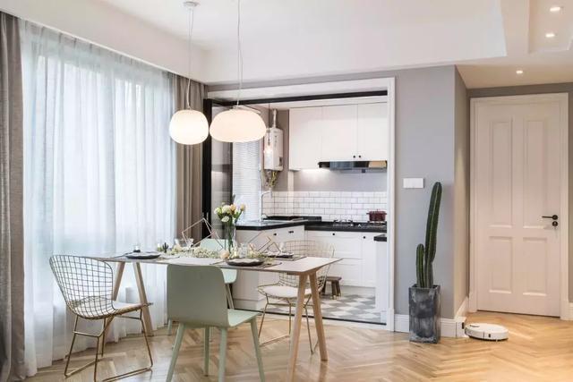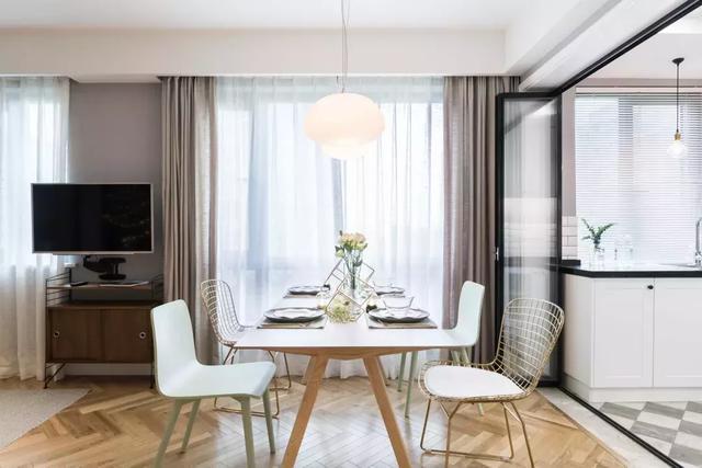 餐厅是典型的北欧风格,非常清新,线条感流畅,餐桌和餐椅的颜色选取上,吊灯的造型上,都是典型的北欧风格。餐桌上的两盏垂吊灯很温暖。
