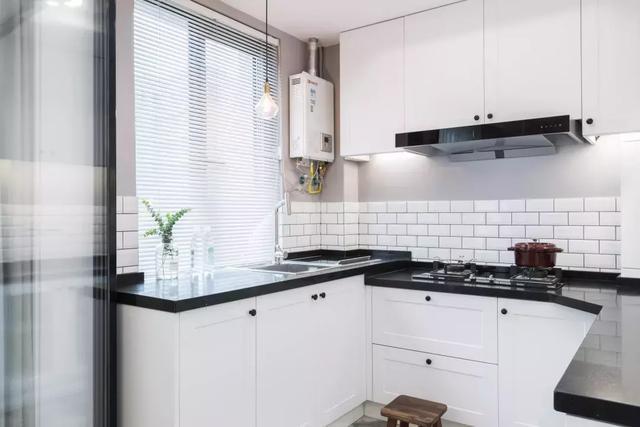 餐厅和厨房用玻璃门隔开,干净卫生,同时采光也很好。小小的厨房,在精心布置设计和布置下,变得简单实用。U字型的设计,黑色的大理石台面和白色的橱柜是经典搭配,清洗区、烹饪区分区明显。