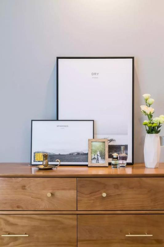 床尾有一个木质的收纳柜,台面上放了两个人的结婚照片和两个装饰画,一张横着的,一张是竖着的,前后叠加摆放,非常浪漫温馨。