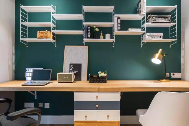 书房的设计以及布局,我相信大家看了,是不是很喜欢。一台钢琴就能体现房主的品味,估计也是一个文艺青年。书桌的墙面是很有个性的深青色,钢琴背景墙是浅灰色的,两者形成了鲜明的对比。