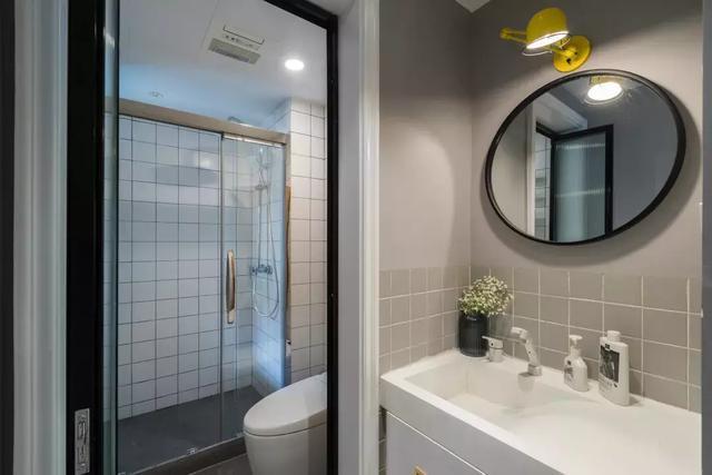 卫生间干湿区很好的分隔开,沐浴房里白色小方格墙砖,很是别致。同样浅灰色的地面和墙面,与整个家形成很好的搭配。洗漱台上面的圆形镜子很有个性,搭配了一个黄色的小臂灯,用来补充照明。