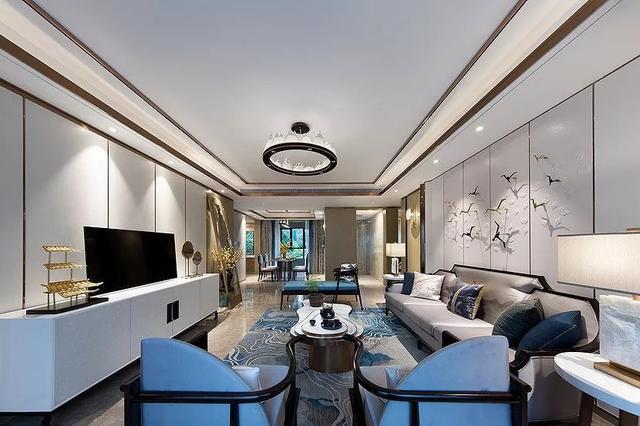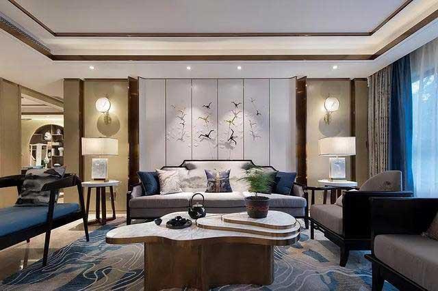沙发背景墙是对称的设计,形成很好的视觉效果。中间白色的底板上面几只飞鹤做点缀。茶几很有古韵,原木不规则形状的设计,为客厅增加了不少层次感。