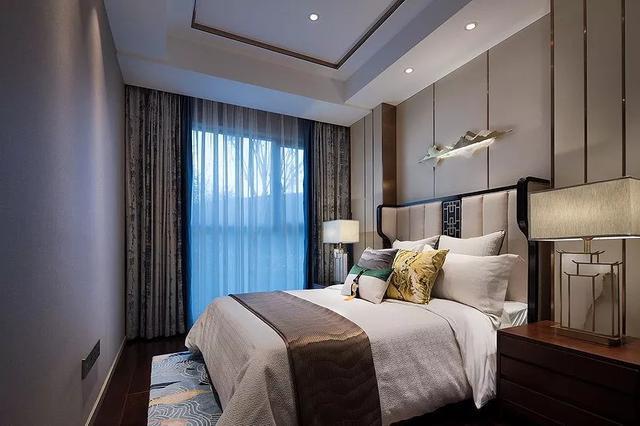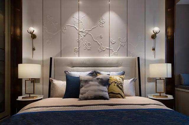 主卧空间的设计呈现出素雅简洁的气质,背景墙以白、灰为主色调,床品以海军蓝和水墨加以渲染,自然勾勒出几分灵动和韵律,给予人无限遐想。