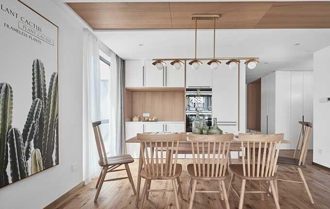这个屋子最大的优点就是采光好,大大的窗户不仅提升了视觉感受,更让整个屋子更通透舒适。餐厅的墙上,巨型画作十分抢眼,装饰效果非常明显,清新而自然。