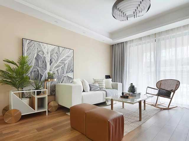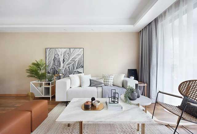 客厅,浅黄色调的沙发墙,搭配白色双人沙发,搭配大小不一的绿植。而大理石茶几两边分别是棕色皮质矮凳和藤椅摇椅,在素色的地毯上呈现以清爽欢快的格局。大大的落地窗,使得整个客厅光线很好,拉开窗帘,又是阳光明媚的一天。