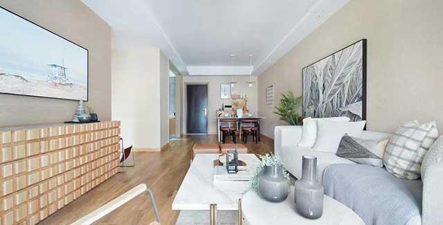 电视柜很有造型,是用浅色木饰板雕刻成巧克力状,很有创意。同时放弃电视并以装饰画作补充,端景出恬静优美的画面。