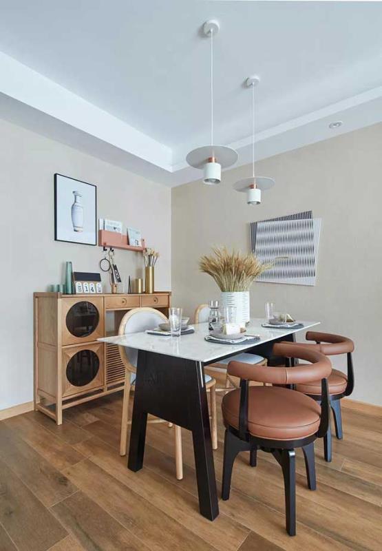 餐厅有十足的文艺范,大理石的桌面搭配黑色木质底座的餐桌,配上棕色皮质和灰色布艺的餐桌椅,再加上两盏简约白吊灯和一个精美的餐边柜,让人不自觉地就放缓了生活节奏,想在这里静静享受美味的食物和有悠闲的时光。