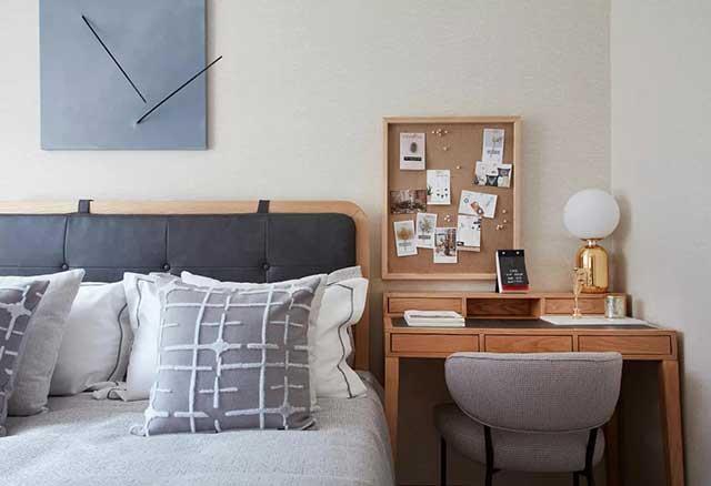 主卧整体素净温馨。深蓝色的床头靠背,搭配淡灰色的床品,温馨舒适,每天都想在床上睡个懒觉。床边是一个原木的梳妆桌,精致优雅的梳妆台搭配墙面的记事板,一个精美的台灯为床头增添了些许气氛,显得浪漫温馨,很是轻松舒服。