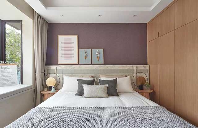 次卧同样的有个性,紫灰色壁纸的床头背景墙上挂着甜美清新的装饰画,搭配大理石质感的护墙板,结合床头两侧对称的布置,带来极具情调的小浪漫。飘窗的设计为次卧增加了一个休闲的空间。床边的木质大衣柜,收纳空间十足,你可以买很多自己喜欢的衣服,想怎么挂都可以。