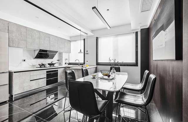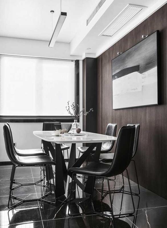 深咖色的餐厅背景墙,白色的大理石桌面与黑色的餐座椅。整个色彩搭配刚刚好,不会因为全部的黑而太过沉闷。