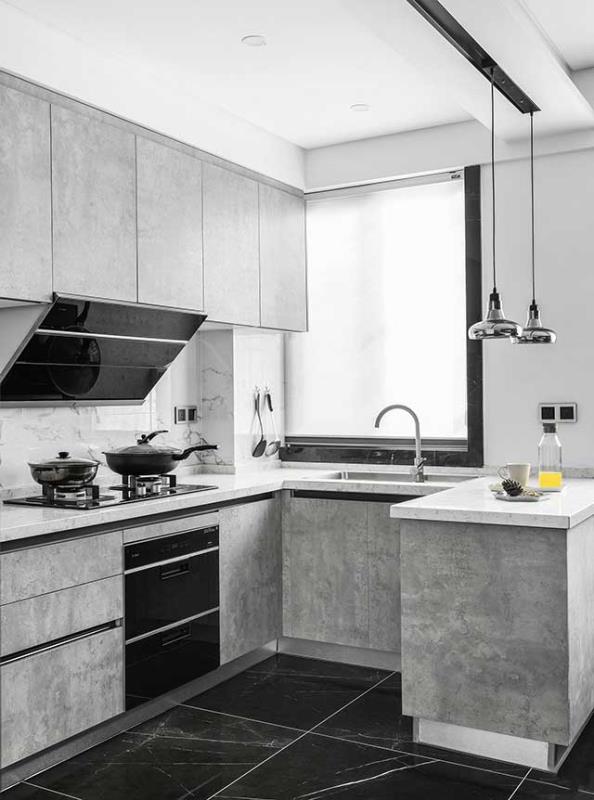 整个厨房的橱柜都是统一定制的,是不是感觉超级有质感。哑光色的水泥灰岩板,粗犷严肃,结合光泽灵动的白色墙面瓷砖,不同材质的融合与碰撞让空间明净且具有超强的质感。