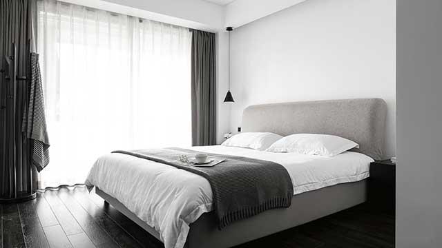 卧室的设计很简单,因为这样舒服安静的房间不想加太多的装饰来打破这份宁静。所以两个黑色的床头吊灯,是卧室仅有的装饰。生活本就复杂,或许家里更应简单。