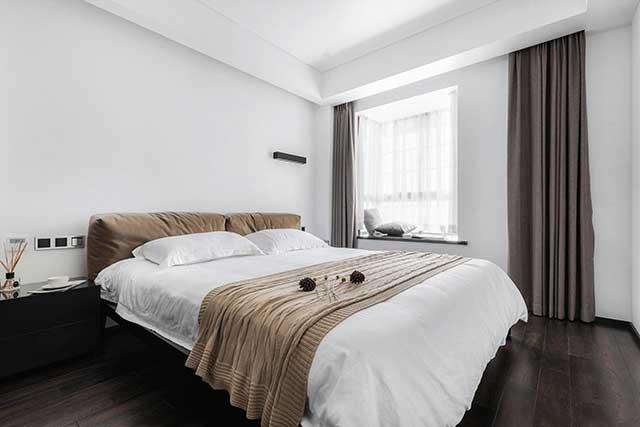 次卧选用了卡其色作为主色调,一张卡其色的床,搭配卡其色的盖毯,配上略带黄调的灰色窗帘,简简单单。