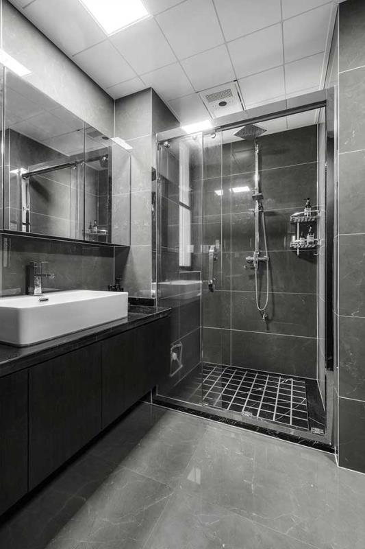 卫生间和客厅是一样的风格,一款暖调的深灰砖,搭配黑色的淋浴房,既保持了调性,又不让整个画面过于压抑,还通过色度的变化,产生一个层次感。白色的洗手盆也给深色系的小空间提升了亮度。z