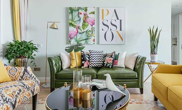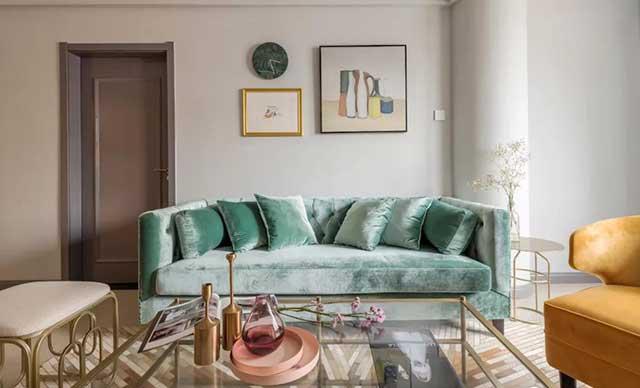 沙发可以用绿色, 丝绒面布艺沙发、 皮质主沙发、 布艺沙发等,不同的材质有不同感觉的绿色。但是这些绿色都是客厅里一道亮丽的风景线。