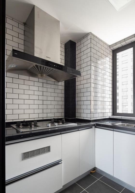 厨房的橱柜用了白色,地面是黑色,黑白搭配是经典的搭配,时尚的同时也耐脏。白色的砖块。使得厨房更有层次感,有了更好的视觉效果。