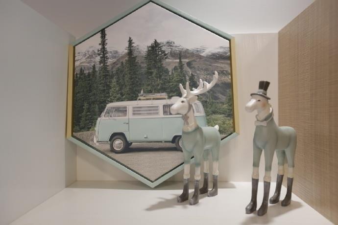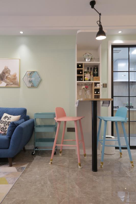 多种颜色构成的一角,以淡色为主,清新舒适,又有着属于童话的俏皮。家具选择的相当精致,甚至每个椅子腿都被包裹。小小的吧台占地不大,但情趣十足,闲暇时可以在这里小酌几杯。