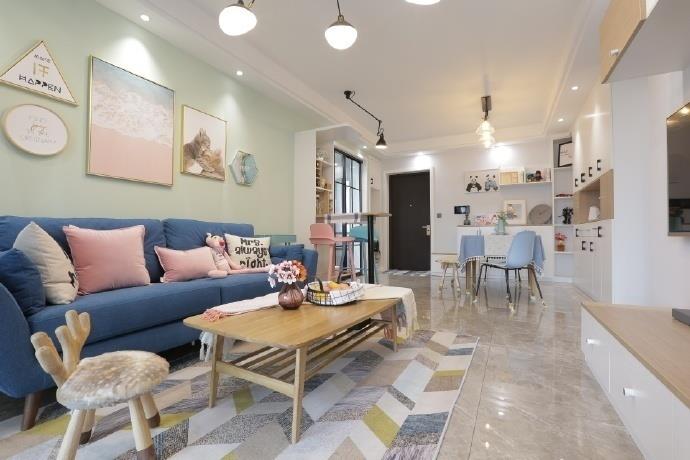 客厅面积不大,但精致的装修让整体空间看起来有几分小资、浪漫的味道。粉色充满了少女心,壁画精致而简洁。拼花地毯柔软而舒适,增添了不少格调感。