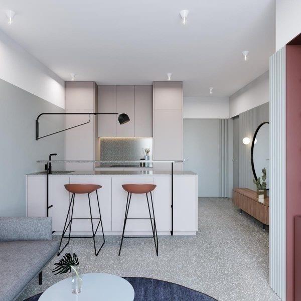 小小的公寓几乎是一览无遗,餐厨结合,格调中岛设计结合了餐桌,既做了完美的装饰,也提供了用餐的地方。开放式的厨房整洁,淡粉色梦幻而简约,又有几分温暖,恰好是个有爱的烹饪空间。