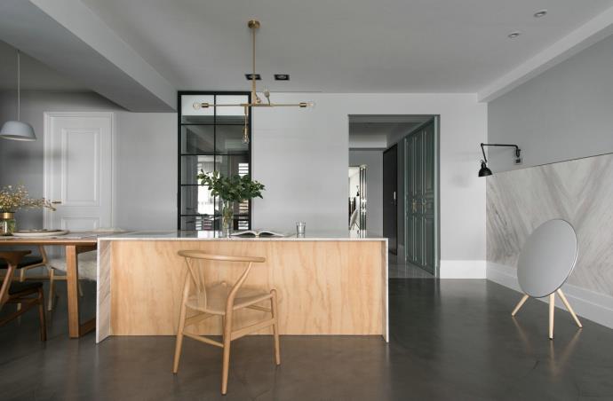 餐厅十分宽阔,厨房门口是一个中岛设计,简约风的中岛有着清新质感,搭配上绿植点缀,有着春风拂面的感觉。墙面依然以白色和浅灰色为主,中和了深灰色的地板。吊灯造型突出,金属元素亮眼,让简约的空间也变得出彩。