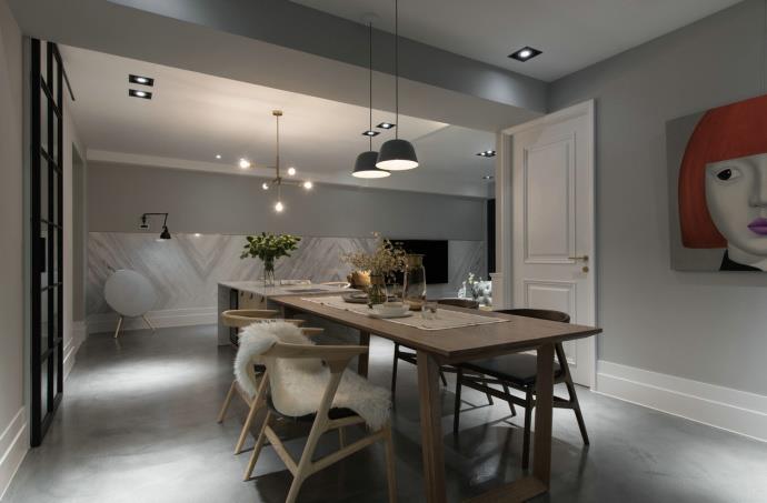 餐厅的设计依然以简约为主,墙壁等都没有过多的装饰,壁画却十分亮眼,有着非常强的装饰作用。餐桌椅简约、自然,展现着生活的真谛。