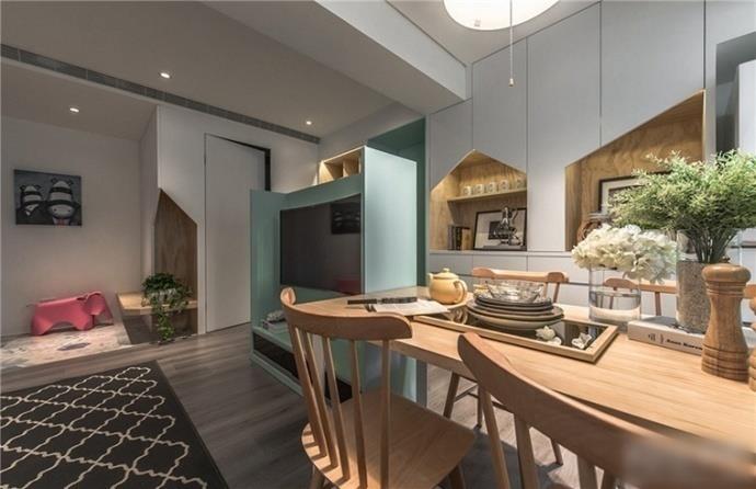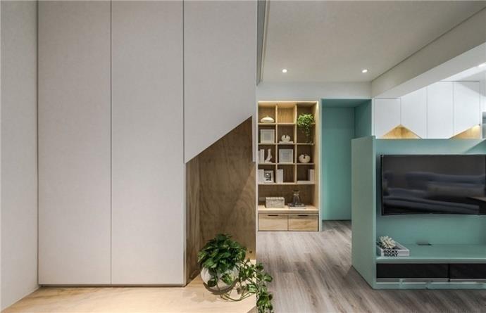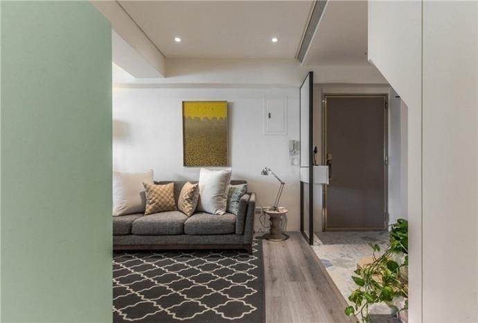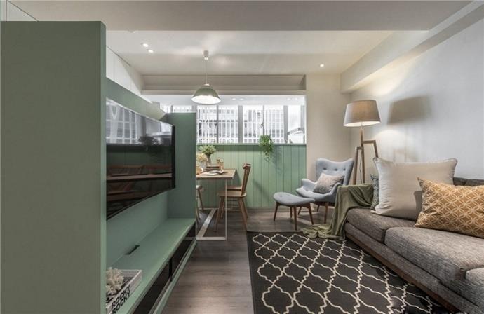 这个案例的绿色是高级灰色调中的绿灰,用在家居中正合适,方便营造出时尚和高级感。可以看出房子的面积并不是很大,留给客厅的面积也有限,电视背景墙的设计是比较巧妙的,作为背景墙的同时,它也是一个隔断,将客厅和后面的空间完美分隔。