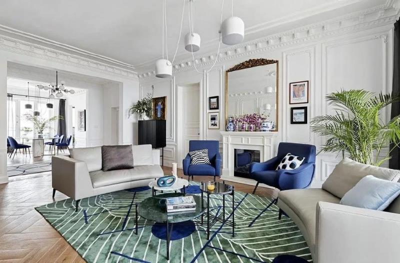 宝蓝色的椅子、松石绿的圆形茶几,与绵软的地毯相互映衬。背景墙为壁炉样式设计,有着浓浓的北欧风。几幅壁画,增添了艺术氛围,打破了整个空间完全的对称格局。