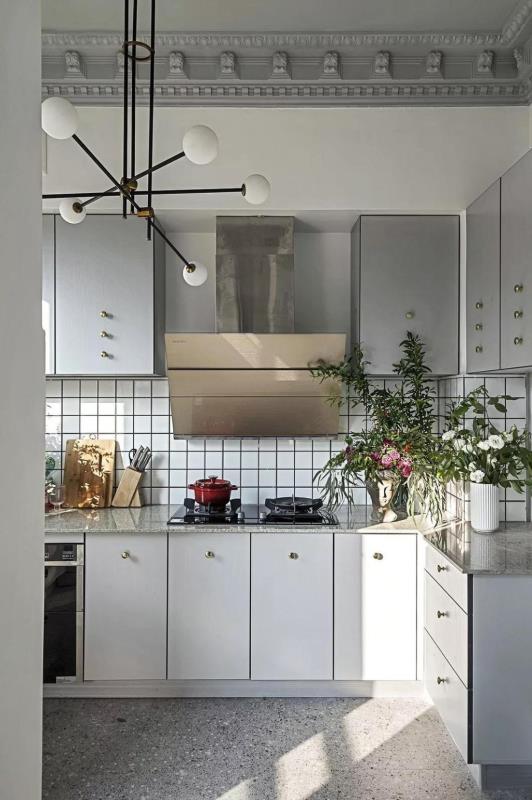 在有设计感的屋子里,厨房也变得浪漫,插了花,有阳光照射进来,阳光和花香一起袭来。以白色和灰色为基调,简约中透着格调,典型的小白砖,有着专属于北欧的味道。