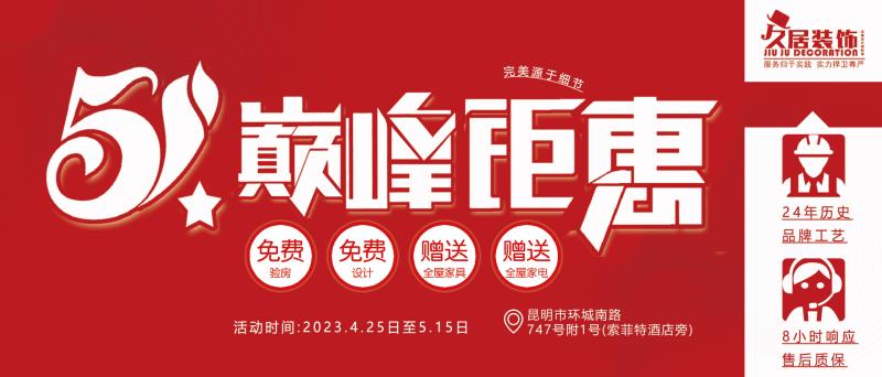 五一黄金周巅峰聚惠、装修嗨翻天。活动持续一个星期,不用担心轻易错过,机会多多。考虑到客户在装修方面都希望尽可能的省钱,也是为了感谢客户对久居的信任,因此给大家准备各种大礼福利,有装修需求的业主们抓紧报名参加吧