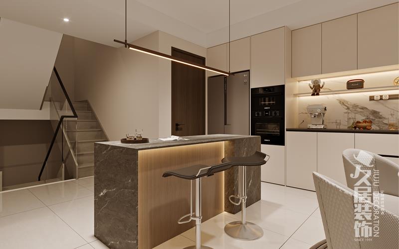 餐厅里,开放式厨房与吧台相连,烹饪于此成为艺术,烟火间满是生活的精致。餐桌与艺术陈设相映成趣,彰显不凡品味。