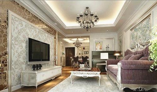 白色的格调加以多彩的颜色的搭配,使得空间色彩丰富但不显凌乱。精致的铁艺吊灯和简单的白色吊顶是客厅装饰的标配,金黄色与白色搭配的背景墙别出心裁的刻上花纹透露出富丽堂皇的气息,与之对应的是精心搭配的壁画,使得空间更有质感。红木原色的桌子与紫色格调的布艺沙发相辅相成,实木的地板砖配上白色的地毯与整体空间更为和谐,在灯光的照照射下空间显得安静祥和。