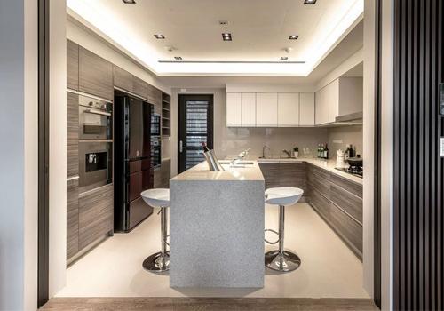 居室内的厨房整体以黑白色调为主,白色吊柜搭配深色立柜迎合屋主的绅士风格,采用触感顺滑、光泽度高、材质均匀的大理石做吧台,在灯光的映衬下更具精致感。
