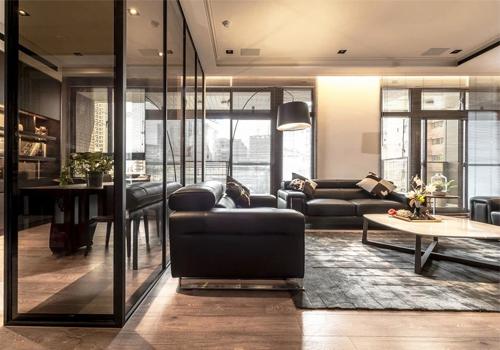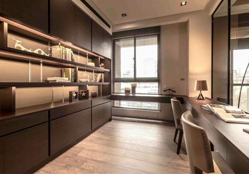 书房设置在客厅旁边,深色的书柜以及长方形书桌,对空间的利用恰到好处。在书架上摆放各类书籍以及一些精致的摆件更能彰显更有人文情怀,同时还凸显了屋主的内涵品位。在空间视觉的处理上,采用黑色框架的玻璃隔断,使书房的空间显得更为开阔。