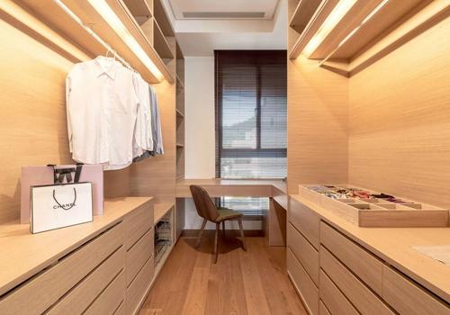 衣帽间在设置在卧室的一侧,整体装饰材质主要以木质为主,空间的每一个角落都得到了充分的利用,衣帽间还设置了一张工作用的桌椅,完全不影响衣服的放置,而且还提升了空间的利用率。配上暖色的灯光,使干净利落的空间减少了一些冷硬气息,多了些温暖的气息。