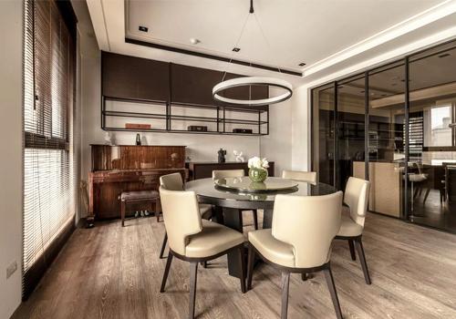餐厅的采用玻璃落地窗,配上百叶窗,实用利落,原木色的地板和富有古朴气息的柜子,给人以种沉淀于岁月的一种美感。与立柜相对的位置设计了简约利索的木质餐桌搭配米白色座椅,天花板上造型新颖的吊灯凸显一种简约之美。餐厅的桌子上摆放的饰物,将沉寂的空间点得鲜活起来。