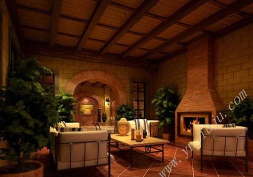 这款客厅是充满了异域风情的西班牙装修风格,原木色的天花板、地砖、以及植物盆栽再加上极具沉重感的砖墙,这些装饰都将西班牙回归质朴的装修风格演绎得淋漓尽致。客厅整个空间线条、造型设计隐约凸显着西班牙风格的狂野、庄严感,室内家具都比较接近自然色,而且材质感觉质地都比较硬朗。最能表现这类风格的还有精雕细刻的壁炉,凸显豪宅的一种大气感。