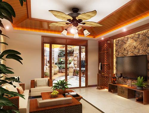 东南亚风格也是一款饱含东南亚风土人情的精致文化品位设计。室内木质的材料大多以褐色为主,在视觉上给人以泥土与质朴的感觉。搭配粗糙肌理的铜片吊灯,凸显一种民族特色的厚重感。石头原始造型拼凑出来的客厅电视背景墙、以及绿色盆栽、竹子编织的电视抽屉柜、质朴的茶几等等装饰,使得客厅显得自然古朴,给人一种雨后阳光的清新舒畅感。家具的选择规避了色彩的花哨,这样纯朴的味道很合适休闲、放松。