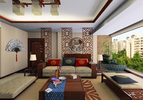 这款客厅采用新中式的装修风格,是一种中式装饰设计元素与现代材质的巧妙结合。精致雕饰的客厅吊灯,以及镂空的隔断、古韵文字符号雕刻、古朴韵味的扇子、以及古典中式的抱枕纹饰,都是古色古香与现代简约元素的完美结合。客厅的落地窗让室内与室外的景色相映成趣,客厅一角摆置了绿色的竹子,更为空间凸显了一种东方文化的魅力。
