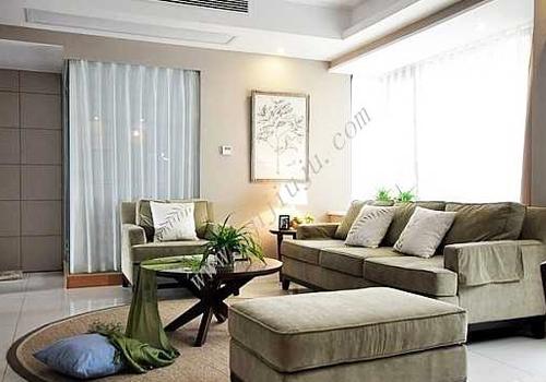 这款比较具备现代特色,为现代简约休闲风格。空间内少了很多装饰的元素、设计的线条也比较简单。客厅的沙发采用贴近自然的浅军绿,与米白色的抱枕搭配,更有舒适感。茶几选用深色的圆桌,都是比较简单的搭配。白色纱窗帘,让阳光照进室内显得更温馨。墙上的画饰采用现代风格的画作为装饰,更贴近自然的气息。再加上茶几的绿色盆栽,更有一种舒适、休闲的美感。简单的造型、摈弃复杂的元素更能给人一种自由、轻松感。w