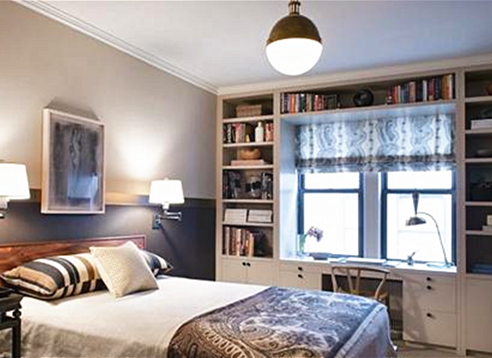 卧室的飘窗经过设计师的精心设计,也能绽放光彩,小小的飘窗的四周设计成书柜的形式。可以最大化的利用空间,书柜上放置主人喜爱的书或是其他的礼物转眼就化身成为一个收纳物品的小天地。多个的抽屉是最使用的收纳箱,放置主人琐碎的衣物或是其他不常用的物品不仅可以方便主人取用而且还使得房间干净整洁。书桌依窗而设,满足了对光线的需求,也使得空间更为明亮。卷帘的设计更加人性化,不会使得空间凌乱,而且方便调整窗帘的位置,能够最大程度满足对阳光的需求。