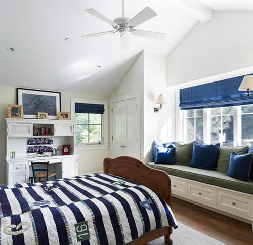 阁楼式的房间无疑是追求别致的人最喜爱的风格,白色为主调的空间里蓝色与绿色互搭的飘窗让人体会到自然与蓝天的气息。蓝色如天如海,给人宽阔或宁静的感觉而绿色的清新与柔和使得自然的气息蔓延开来。依窗而搭的小沙发成为最浪漫的休息场所。劳累的时候依窗小憩看看屋外的景色阳光正好。而抽屉的设置也是收纳的最佳帮手。