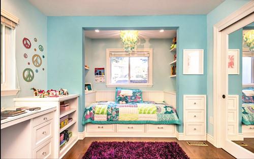 儿童房的飘窗是最灵活的,小小的书桌或是儿童玩乐的天地无疑都是最佳场所,而此间飘窗设计成为儿童窗不仅节约了空间还使得儿童活动的空间增大,可谓是一举两得。飘窗设计为床也能保证儿童的安全。因为孩子睡觉时喜欢乱动,三面环墙的话可以防置孩子摔下床,周围的墙面上可以放置图书和玩具,把被子一叠床铺摇身一变就成为孩子看书或是玩乐的小天地,既实用又美观可谓是家庭必备。